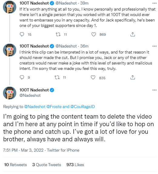 Regardless, the video has been removed, and 100T have issued their apology. In his apology, Nadeshot stated that the clip should have never made the cut.