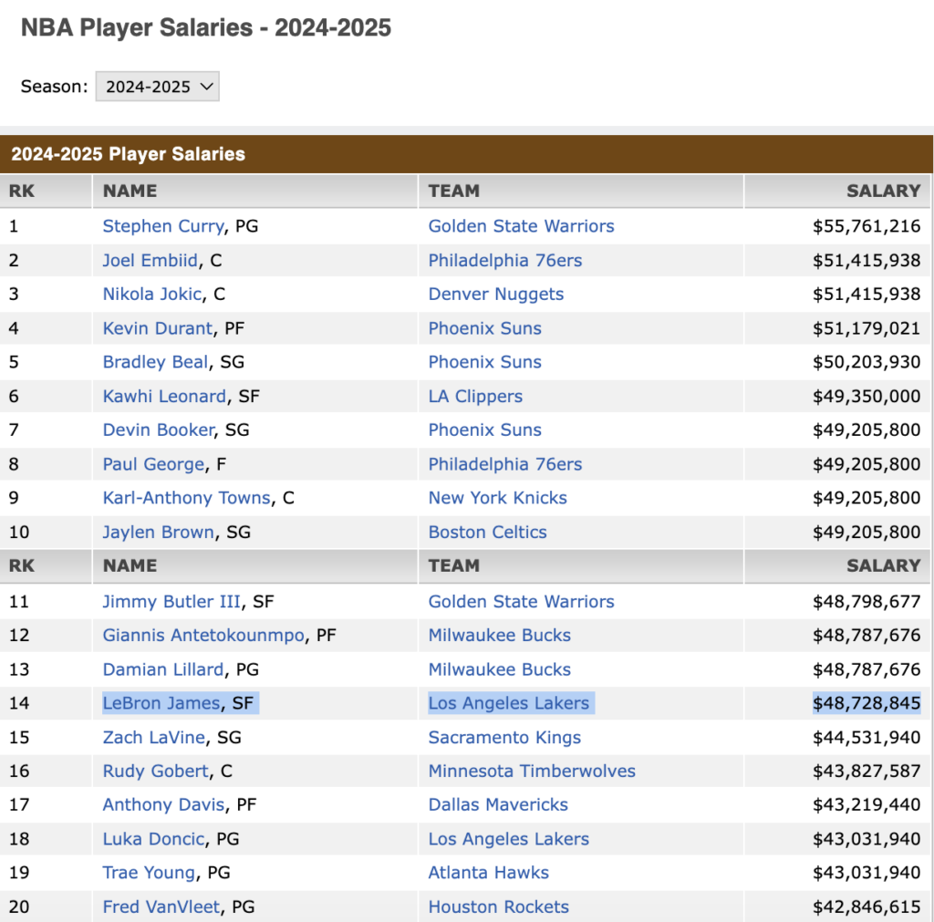 In reality, ESPN lists LeBron’s 2024–25 salary at $48 million, meaning Sophie was only $5 million short, not $13 million as she claimed.