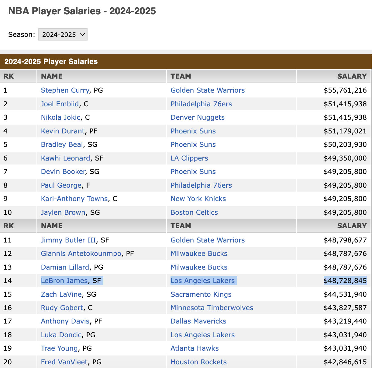 NBA salaries for the 2024-2025 season (via ESPN)