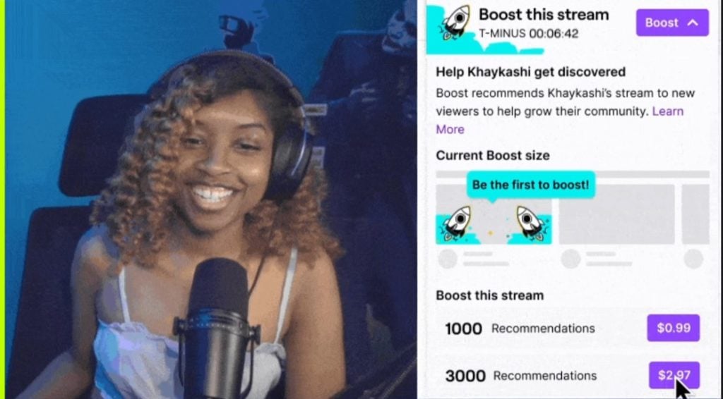 - Clear Impact: Each community member’s purchase will add more frontpage recommendations for creators. We’ll call out to the community who’s made the purchase and share with everyone exactly who may recommend the community has unlocked as the purchases roll in. Creators can also see the impact of boosts have on their growth as Twitch will share statistics with the streamers.