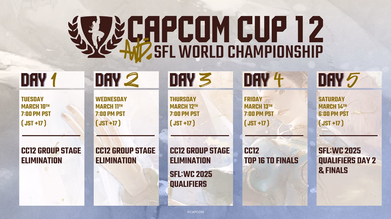 The event happens from March 11 to March 14. All the Capcom Cup 12 live streams start at 11 a.m. JST / 3 a.m CET / 10 p.m. ET (on the previous date).