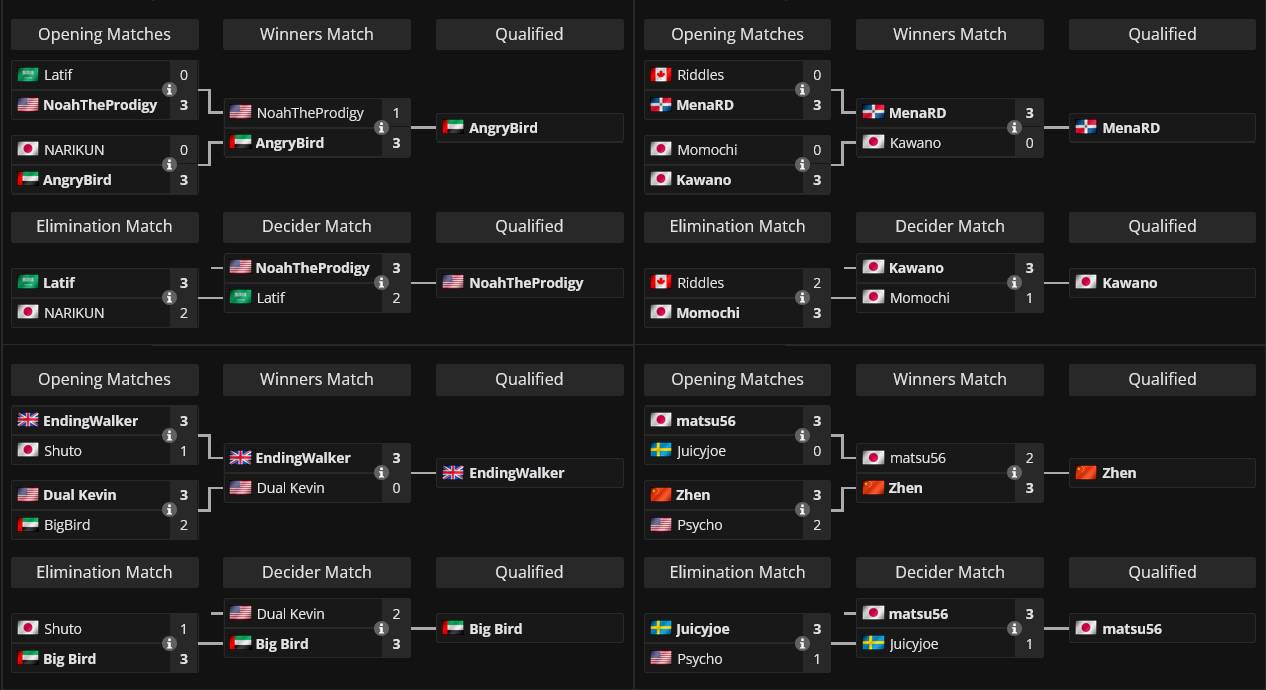 | NoahTheProdigy 0:3 BigBird Luke vs Rashid | matsu56 3:1 moke Kimberly vs Chun-Li | Tokido 1:3 NL Ken vs Akuma | Higuchi 3:0 pugera Guile vs Sagat |