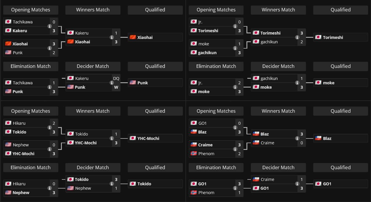 | Kawano 3:1 BigBird Akuma vs Rashid | Punk 3:1 moke Cammy vs Chun-Li | GO1 3:2 NL Chun-Li vs Akuma | DCQ 2:3 pugera M. Bison vs Sagat |