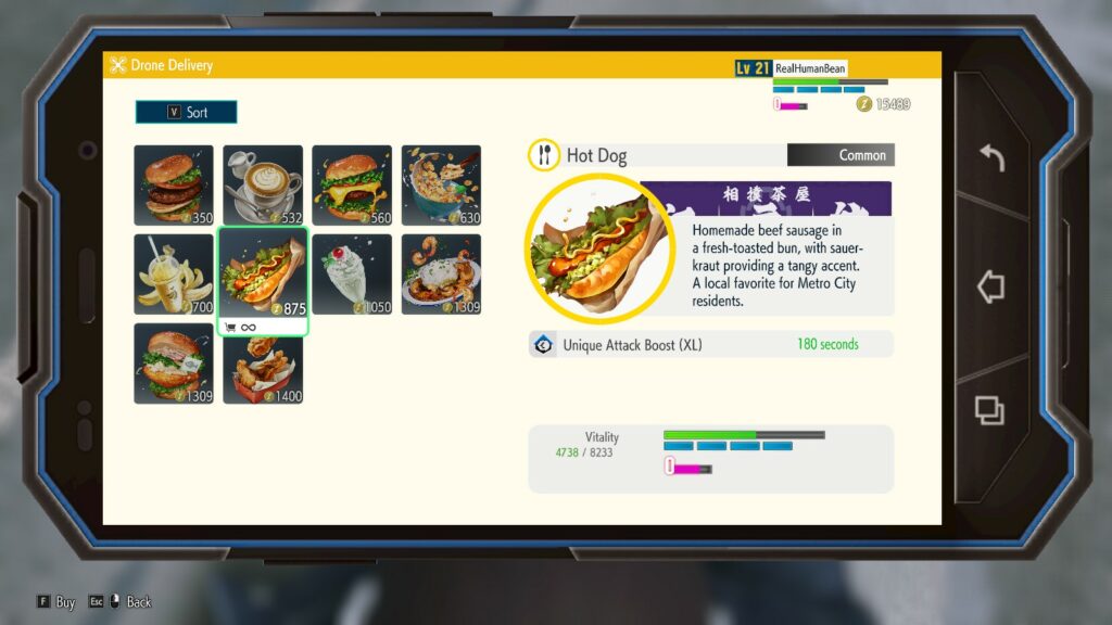 Simply press your Device button to bring up the menu and select Delivery. A short list of items will be available with buffs and boons. These are usually fast food options and boost things like your attack bonus, punch damage, defense, and other stats.
