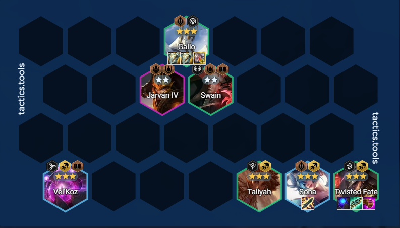This is your standard Twisted Fate carry composition that you should want to default to playing when selecting the Twisted Fate legend. If contested, you may not be able to 3-star everything. This might mean you will have to pivot to Jarvan as a tank or Vel’koz as a carry. But this composition can support more than one player, so sticking to reroll Twisted Fate could be your best bet.