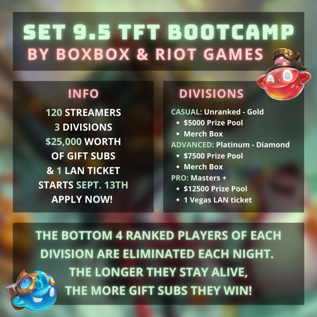 Teamfight Tactics (TFT) Set 9.5 just went live today. With the release, the Set 9.5 Boxbox Bootcamp has begun. This iteration is the biggest it’s ever been, with three divisions and 140 total participants!