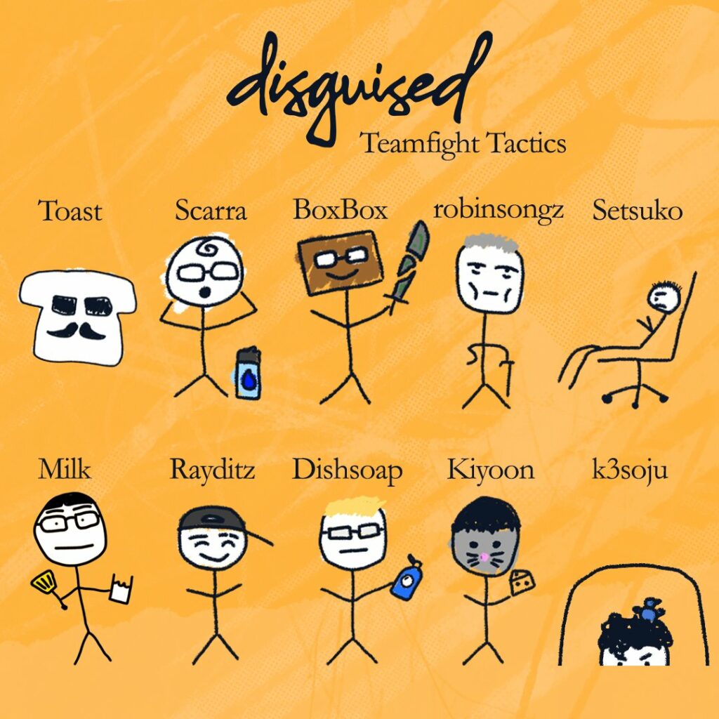 Disguised Toast held a tournament at the end of Set 9.5 to determine one competitor that his organization would fully sponsor to the Teamfight Tactics (TFT) Vegas Open. Milk won this tournament and was the first TFT professional player to join the organization. Shortly after, Toast announced that he would be signing a full 8-man competing roster for the tournament. Toast and one other professional TFT player also joined the 10-man squad as co-streamers for the event. Without further ado, here is your DSG lineup for the TFT Vegas Open!