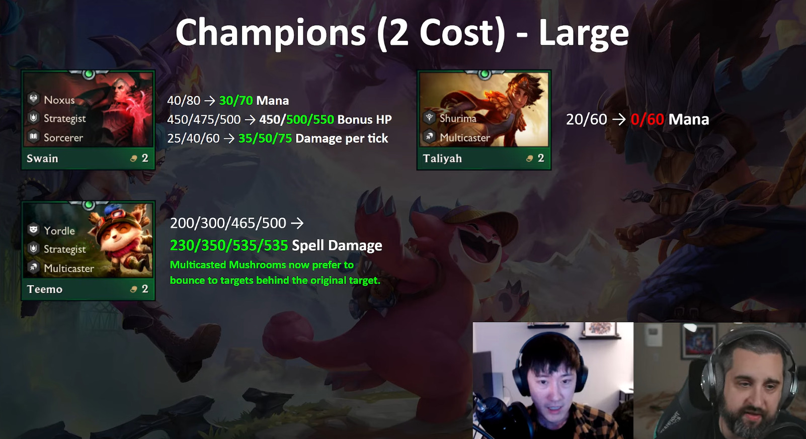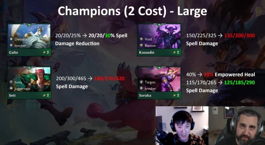 Sett and Soraka are too reliable as early-game units. Teemo and Swain are being buffed rather significantly which could bring rise to a new Yordle reroll composition in the meta.