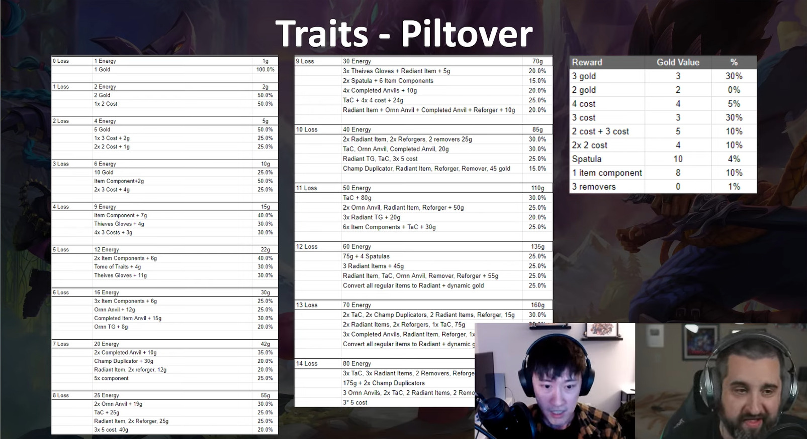 Piltover is being reworked heavily. Currently, hitting 3 piltover in the early game usually means sacking Stages 2 and 3 and playing for Zeri carry with T-Hex as an extra damage/tank unit. The balance team wants to change the trait to be more of an economy/loot trait rather than introducing another unit to the team. T-Hex power levels are now significantly reduced and cannot be sold. Instead, accruing losses and then winning will automatically drop loot according to the table in the above image.