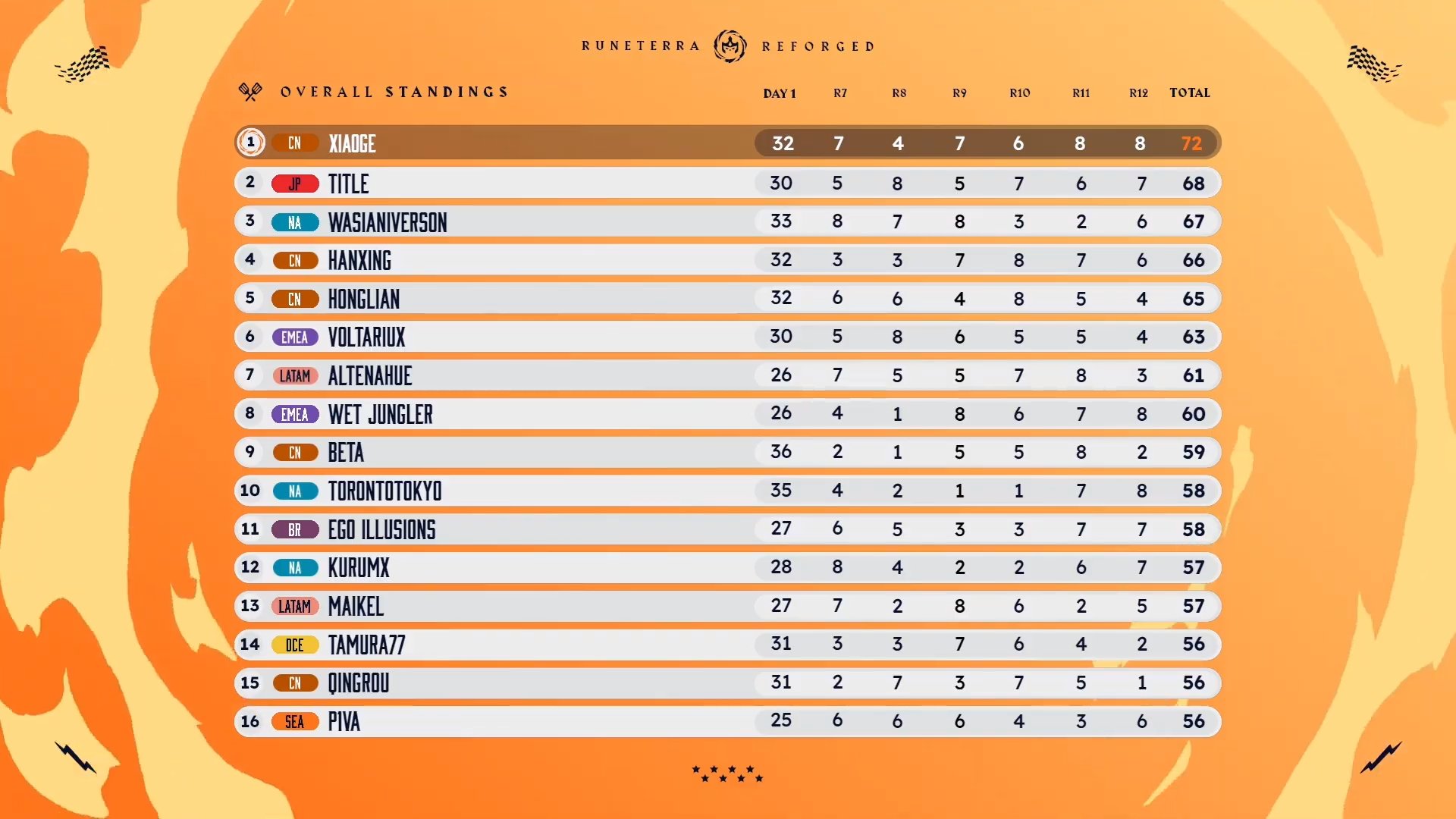Points are awarded from 8/7/6/5/4/3/2/1 for first through eighth place respectively. Games are being played on patch 13.21.