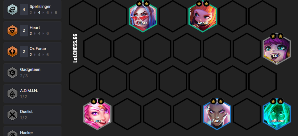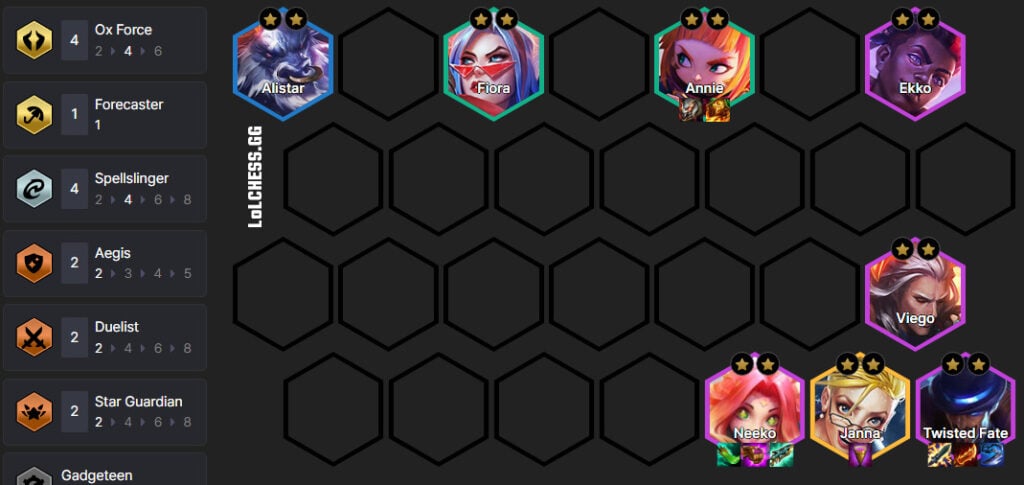 Here is your ideal level 8 board. The strongest version of the Twisted Fate carry composition currently revolves around playing 4 Ox Force, 4 Spellslinger, and 2 Duelist. This gives your team an amazing frontline and backline to support the carry of Twisted Fate. If you don’t hit Janna on 8, Sona is your best unit that slots in, giving your team 4 Spellslinger and 2 Heart.