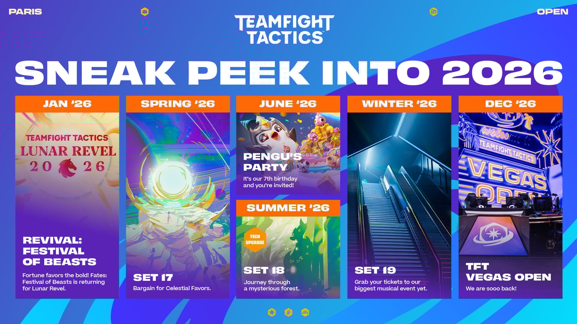 On Dec. 14, Riot Games gave players a sneak peek at the TFT 2026 roadmap. The year will begin with the Revival: Festival of Beasts mode for Lunar Revel. TFT Set 17 will then release in the spring with a theme centered around the cosmos. This will be followed by the summer celebration of the game’s seven-year anniversary. Set 18 will arrive in the same season and focus on a mysterious forest, too. As for Set 19, it will involve music. The year will then conclude with the TFT Vegas Open.