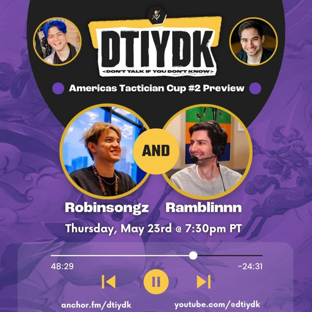 We present the NA TFT Power Rankings Edition #29 in collaboration with the DTIYDK Podcast. In this episode, the podcast will discuss players' form with special guests Robinsongz and Ramblinn. In this episode, we discuss the Americas Tactician Cup #2.