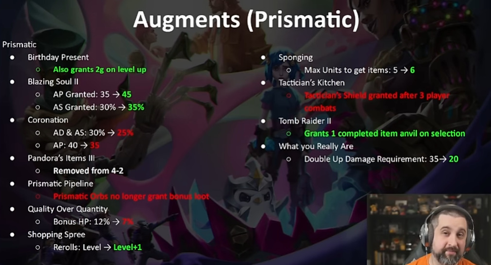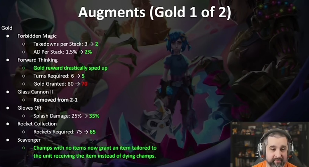 | Gold Augments | Forbidden Magic | Takedowns per stack: 3 → 2. AD per stack: 1.5% → 2%. |
