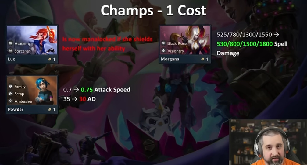 | 1 | Morgana | 525/780/1300/1550 → 530/800/1500/1800 Spell Damage. |
