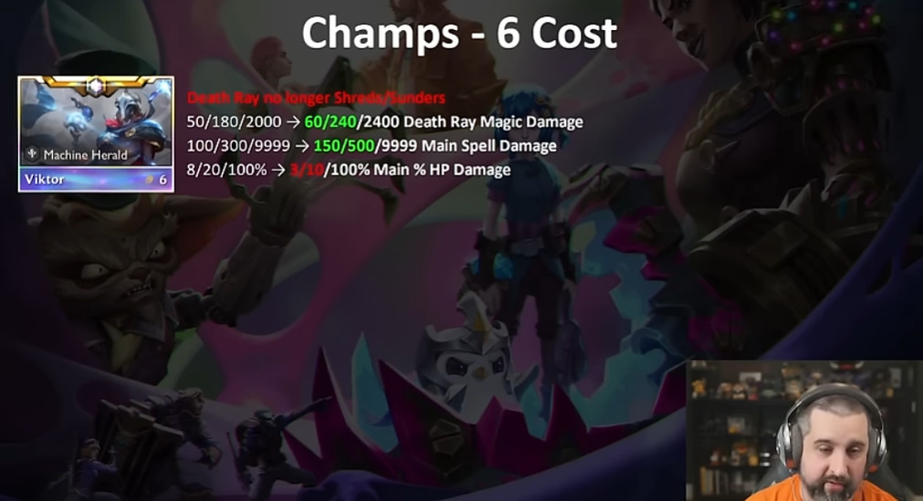 | 6 | Viktor | Death Ray no longer Shreds/Sunders. 50/180/2000 → 60/240/2400 Death Ray Magic Damage. 100/300/9999 → 150/500/9999 Main Spell Damage. 8/20/100% → 3/10/100% Main % HP Damage. |