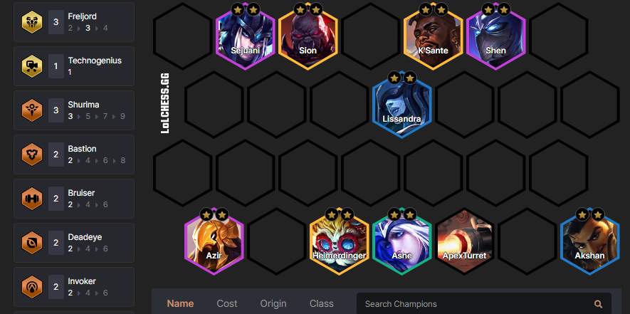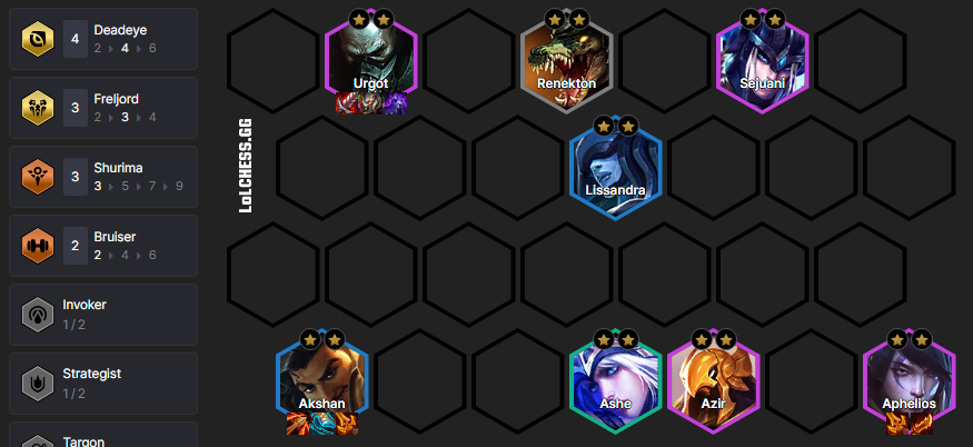 Above is what your board should look like at levels 7 and 8. The most important synergies to maintain are 3 Freljord, 3 Shurima, and 2 Deadeye, so you will always be fielding Sejuani, Lissandra, Ashe, Akshan, and Renekton as your core units.