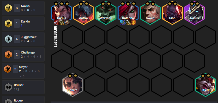 Noxus reroll is still a very strong composition in the current meta. When given the opportunity to play Noxus reroll, you should definitely lean in its direction. The composition is rather simple to execute, but does require early and mid-game tempo because of the way reroll compositions and Noxus as a trait functions. Your board at level 7 should look something like the example, and you will reroll for Darius 3 and Katarina 3 simultaneously as your two carries.
