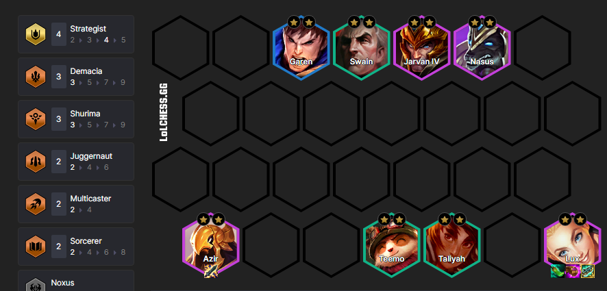This variation is the previously S-tier Lux/Azir duo carry board. With good tempo, this composition is still very strong. However, the composition is expensive and Azir is weaker than he used to be, so if you fall behind aiming for this variant, it is likely you will lose a lot HP in the mid-to-late game.