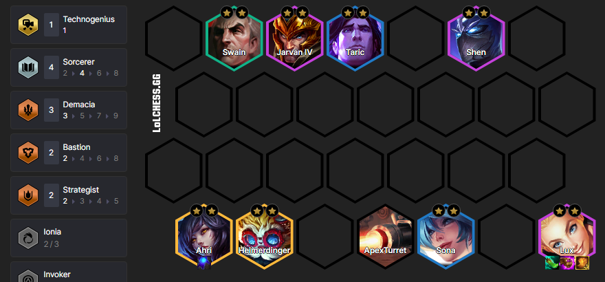 With sorcerer emblem, your game becomes a lot simpler as you can chase the 6 and 8 sorcerer breakpoints for your late-game composition. In the examples, sorcerer emblem is on Sona, but if you’re able to get it onto Shen or Jarvan, it’s very strong. Ideally, Jarvan is stacked with tank items and the sorcerer emblem goes on Shen.