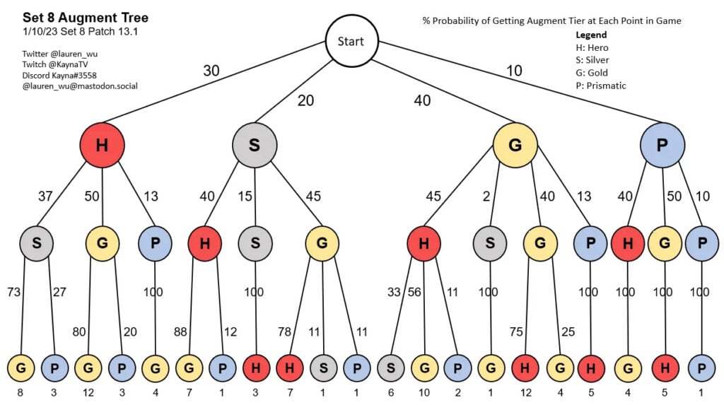 The numbers near the tree’s lines depict the percentage chance you have of seeing a certain augment type. This is an important resource because knowing what augment type you are likely to receive can change some of your planning and decisions.