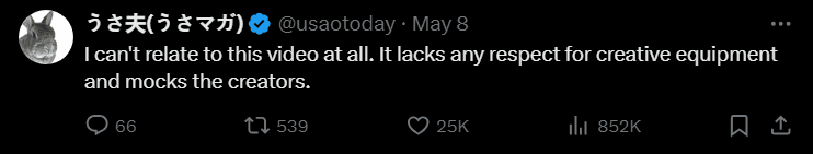 The top comment under the ad reads: "I can't relate to this video at all. It lacks any respect for creative equipment and mocks the creators."