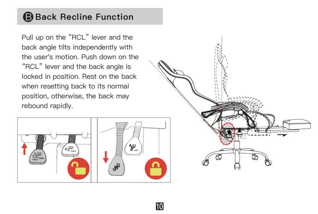 The second Back Recline Function lever (marked RCL) is really ingenious and probably my favourite aspect of the chair. It will tilt the chair based on your movements, so if you’re just chilling watching a show or spinning around to have a conversation with friends and family, it’s a great setting. It also will rise up as you do, so you won’t have to fiddle to get the chair back to the normal position as is the case with other gaming chairs.