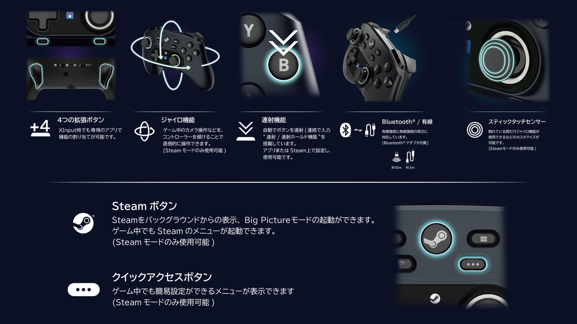 - Stick touch sensor: Customization is possible, such as having the gyro function activate only when touching the joystick. (Available only in Steam mode)
