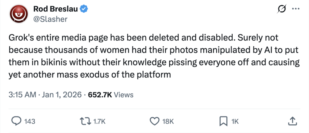 Fortunately, the laughter didn’t go on for long, as Musk eventually saw how harmful this trend had become. On New Year’s Day in 2026, Grok had the “Media” tab on its X profile disabled, as it had become rampant with sexualized images of innocent X users.