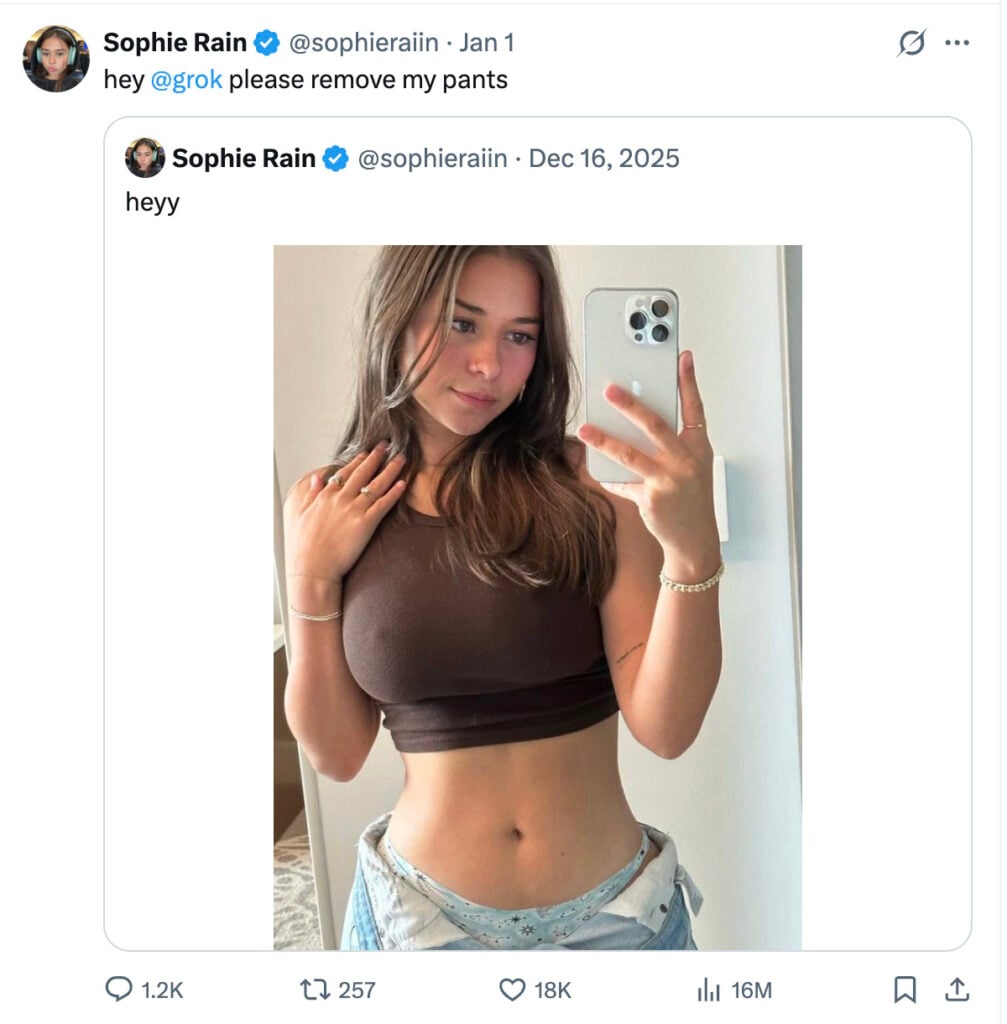 Sophie Rain, a well-known OnlyFans creator – who shared she earned over $80 million in 2025 – was one of many female influencers who embraced the “Hey Grok” trend for engagement, adding fuel to the fire. On January 2 alone, Sophie Rain’s “Hey Grok” posts amassed 30 million impressions on the social media platform.
