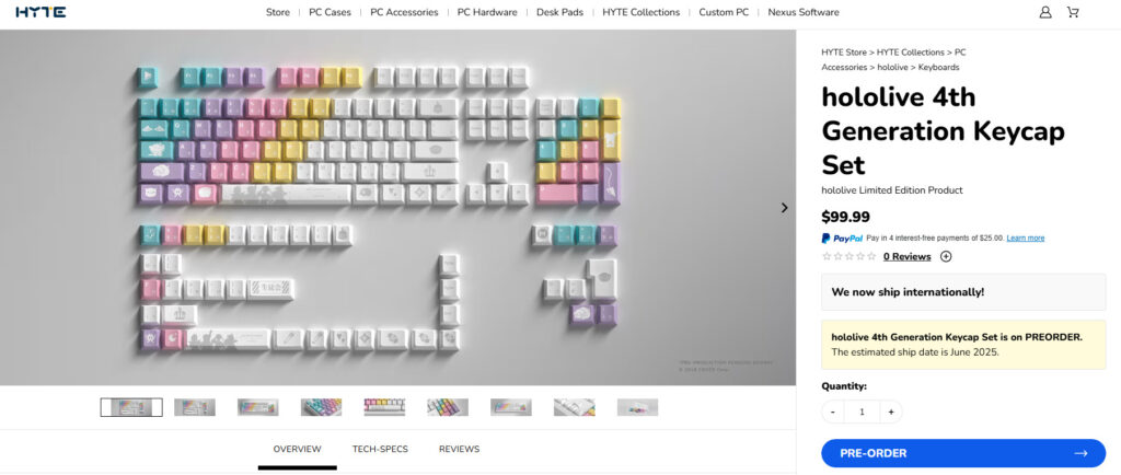 The hololive 4th Generation Keycap Set is now available for pre-order for $99.99 on HYTE.com. HYTE supports various payment methods and international shipping, with an estimated shipping date starting in June 2025. Do note that the listed price is yet to include additional charges like shipping fees and taxes.