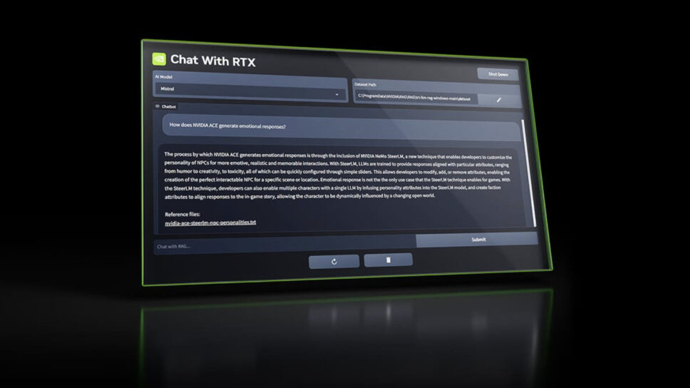 ‘Chat with RTX’ is a custom generative AI that lets users personalize a chatbot with their own content. It uses retrieval-augmented generation (RAG), NVIDIA TensorRT-LLM software, and NVIDIA RTX acceleration. RAG is a technique for enhancing the accuracy and reliability of generative AI models with facts fetched from external sources.
