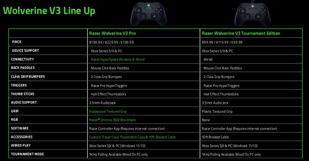 In the specs comparing the two models of controllers, you can see some of the differences like the Rubberized grip on the V3 Pro and the wireless connectivity. Outside of that, and the carrying case that comes with the Pro, the two versions of the Wolverine V3 come in with similar sets of specs.