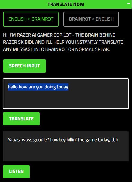 You can choose English > Brainrot or Brainrot < English. The AI Gamer Copilot is the source of the translation and you can type in anything, or even use speech input. It is hilarious and makes you wonder if this will ever be a real product from Razer. Let’s keep our fingers crossed? Or uncrossed maybe.