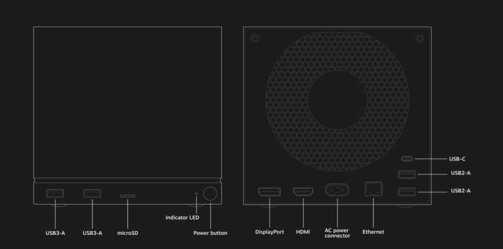 Displays DisplayPort 1.4 - Up to 4K @ 240Hz or 8K@60Hz - Supports HDR, FreeSync, and daisy-chaining HDMI 2.0 - Up to 4K @ 120Hz - Supports HDR, FreeSync, and CEC | USB Two USB-A 3.2 Gen 1 ports in the front Two USB-A 2.0 High speed ports in the back One USB-C 3.2 Gen 2 port in the back | Networking Gigabit ethernet | LED Strip 17 individually addressable RGB LEDs for system status and customizability |