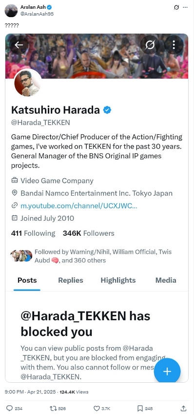 Arslan Ash blocked by Tekken Game Director Harada on Twitter