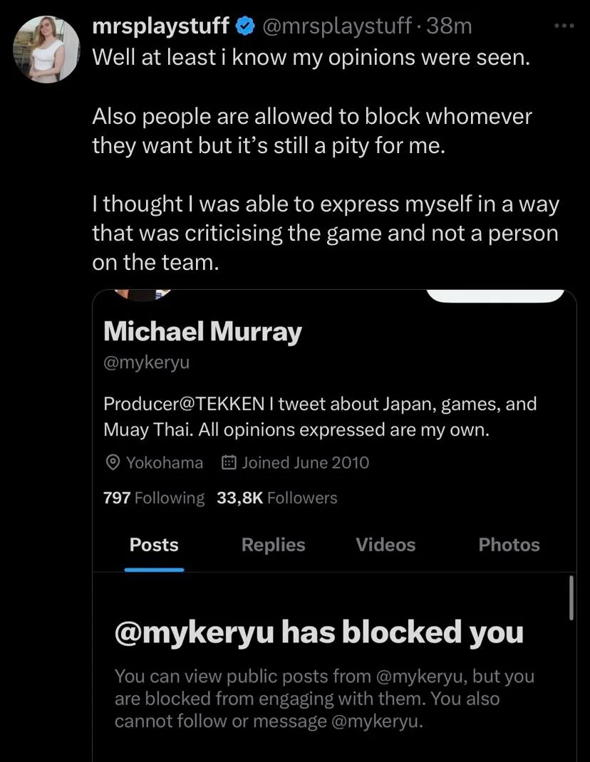 Much like ArslanAsh, MrsPlayStuff shared an image proving she’d been blocked by Michael Murray, which led to an onslaught of criticism towards Tekken 8’s Producer. The tweet garnered over 500,000 impression on Twitter and led to a Reddit thread on the same topic.