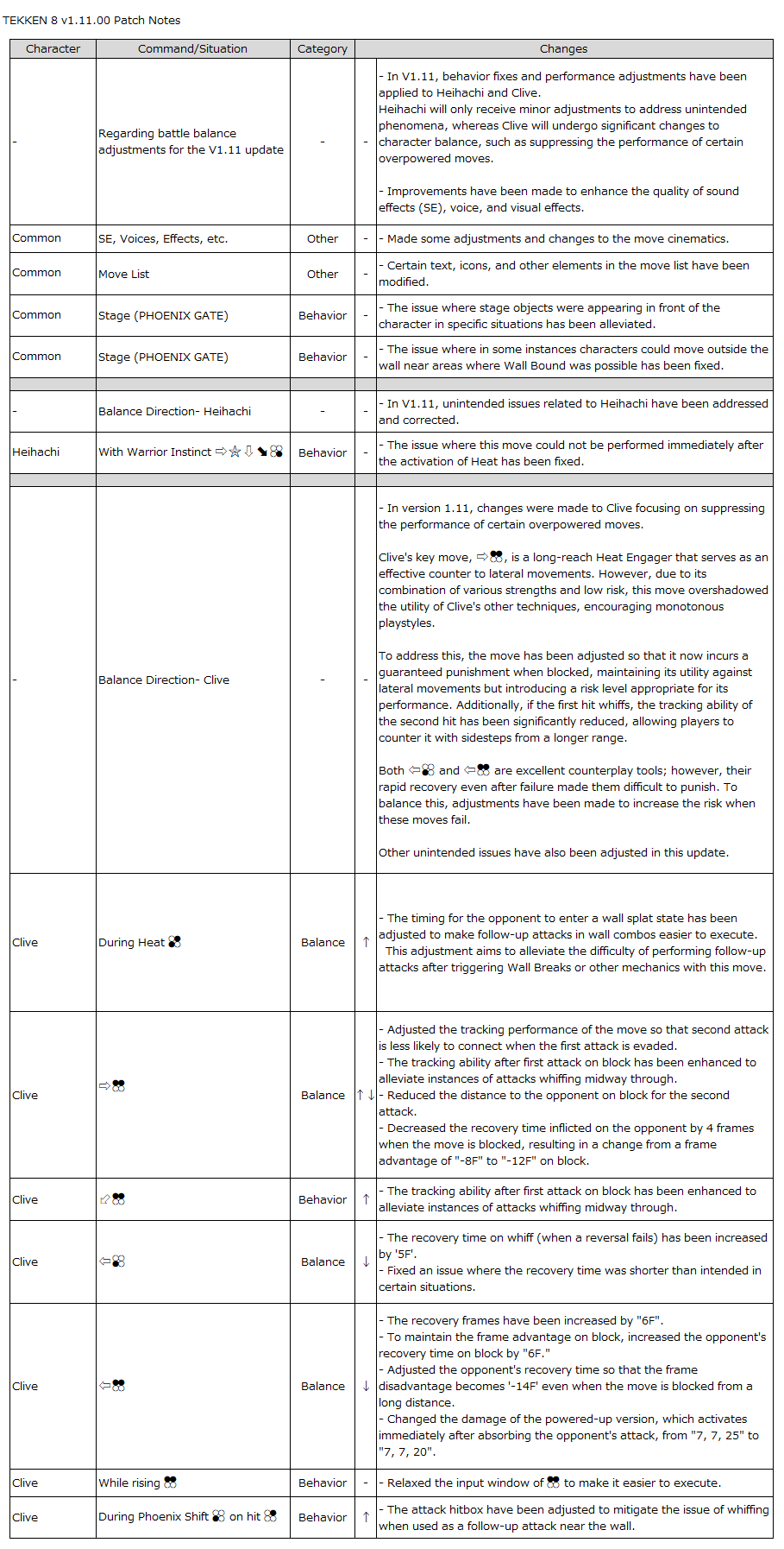 Clive mains, look away. One of the character’s most potent Heat Engager (F1+2) now has an additional 6-frame recovery time, meaning players will be able to punish on a successful block. Developers stated the move had “overshadowed the utility of Clive’s other techniques, encouraging monotonous playstyles.”