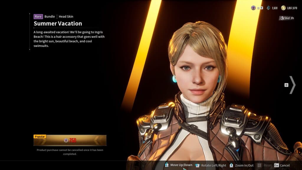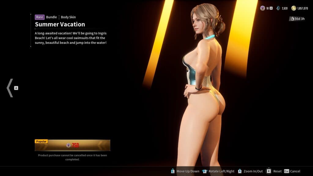 Unlike Valby however, Viessa is not wearing a jacket in her Summer Vacation outfit. She is instead wearing a swimsuit monokini and high heels. The bundle comes with a new Head Skin for Viessa where she is wearing ocean blue earrings that match the colors of her swimsuit. Hairstyle wise its only slightly different to her standard hairstyle.