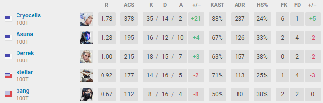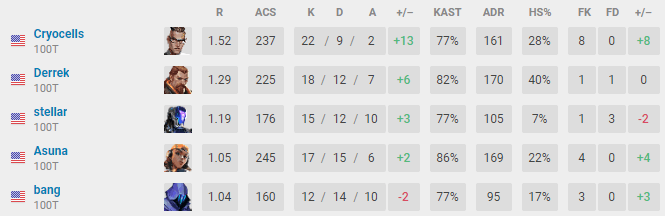 During 100 Thieves' map pick, Fracture, they took the victory with a score of 13-5 with Cryocells playing Chamber once again, leading the match with a KDA of 22/7/1 followed closely by Raze, played by Asuna on 18/9/4. With a total KDA of 53/25/2, Cryocells led 100 Thieves to victory in the semi-finals and secured the first spot in the finals.
