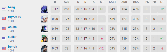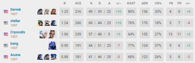 During Red Bull Home Grounds, out of all the team members, Cryocells gathered a total of 258 kills. In terms of total kills and assists, Cryocells had a total of 286, while Derrek had 294 followed by bang with 303, Asuna with 304 and Stellar with 277. During the last A-tier tournament, Champions Tour North America Stage 2: Challengers, 100 Thieves only managed to place fifth to sixth. In that event, the overall contribution of each player was far less even. However, each team member definitely contributed to the victory at Home Grounds with some incredible overall stats.