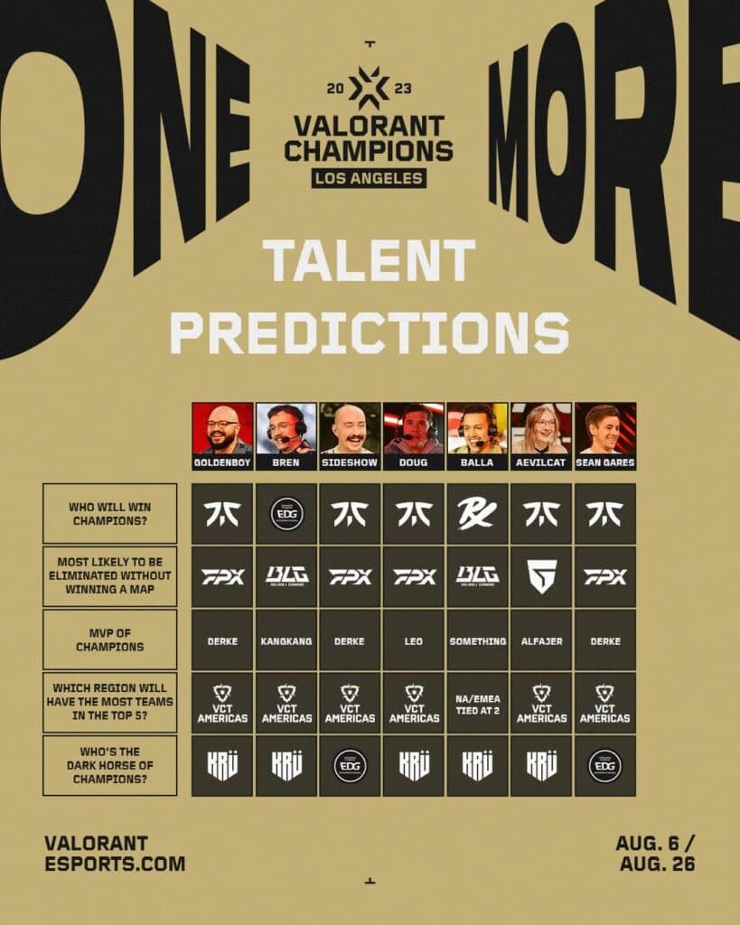 Lastly, we have the Dark Horse of Champions 2023. The broadcast talent predictions are almost all in sync with this one. Five of the seven believe KRU Esports, who just had an incredible LCQ run, will be the Dark Horse. That could very well happen, but Sidshow and Sean Gares believe it will be EDG. Can the best Chinese VALORANT team really be called a Dark Horse, though? Especially after their performance at Masters Tokyo?