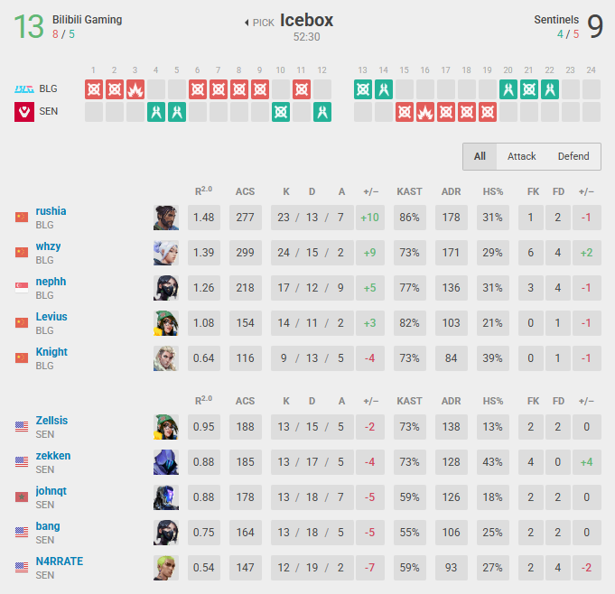 The fans’ hope for a comeback began to rise, but Bilibili Gaming responded with a powerful round to reach 12 points, just one round away from securing the first match victory. Rushia and whzy were leading the charge with standout performances, putting Sentinels under immense pressure and making their comeback increasingly challenging. After almost an hour of the game, BLG won the first map.