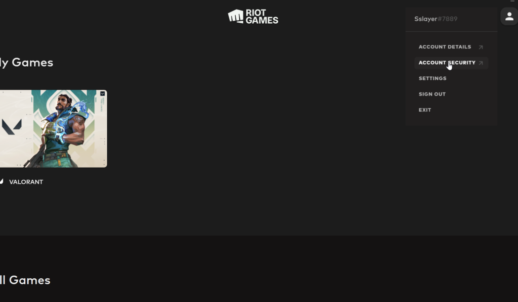 Open the Riot Games client and click on account security settings in the top right corner