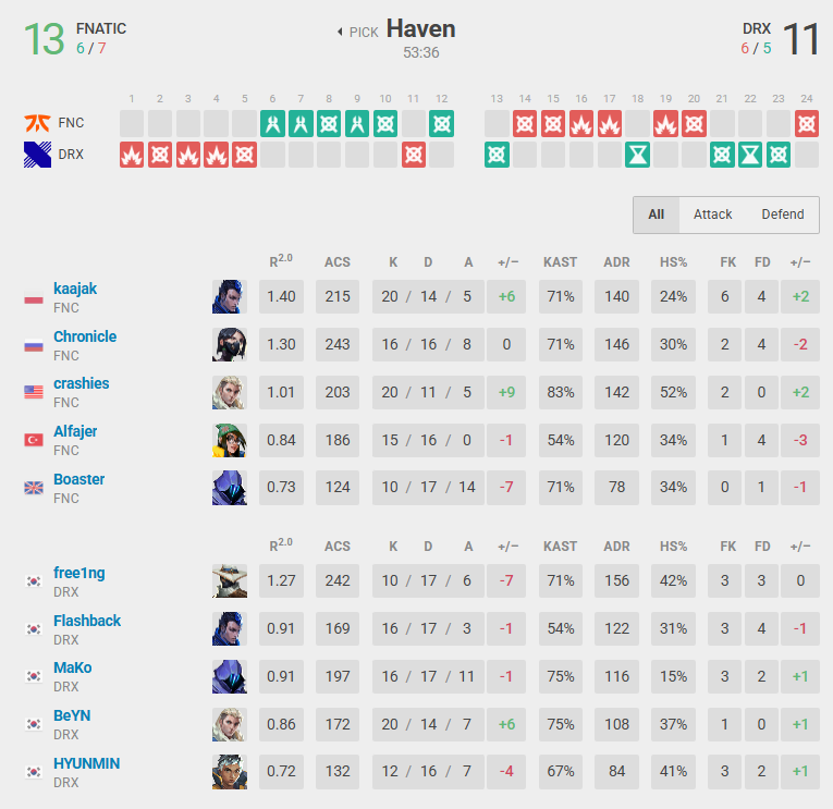 DRX pick DRX player FNC player FNC pick | Cypher (G1) free1ng Alfajer Vyse (G1) | Omen (G1) MaKo Boaster Omen (G1) | Sova (G1) BeYn crashies Fade (G1) | Waylay (G1) HYUNMIN kaajak Neon (G1) | Yoru (G1) Flashback Chronicle Breach (G1) |