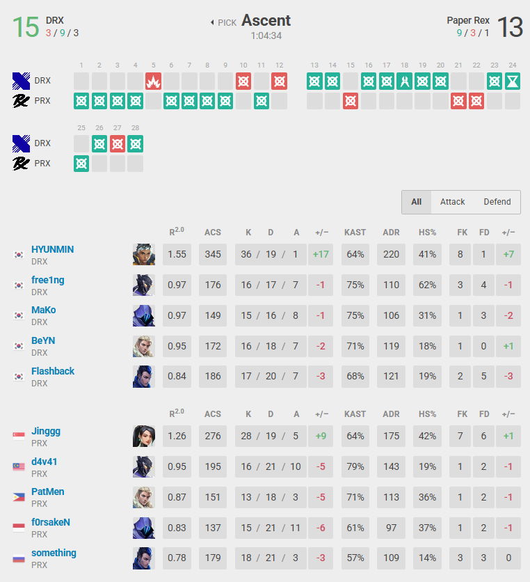 The first map was defined by an early Paper Rex dominance, putting DRX in a very difficult starting position. Yet, DRX refused to go down without an incredible comeback, led by HYUNMIN, who scored 36 kills in a single match. Just when it seemed like an easy win for an overconfident PRX, DRX surprised everyone, fighting back at every opportunity. Their talented roster overcame the dominant PRX and secured a hard-fought victory on Ascent.