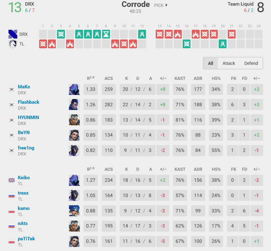 DRX had great moments throughout the first half: like freeing winning a 1v1 versus keiko in Round 5 or MaKo defusing at the last moment in Round 7.