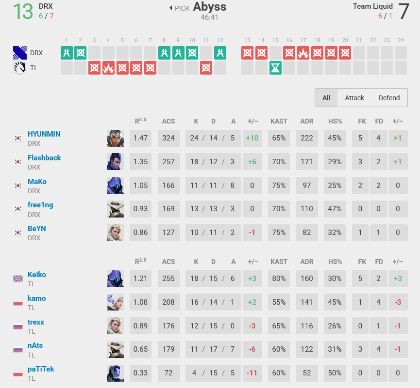 DRX overclassed their opponents in this match thanks to their patience during difficult rounds. It was obvious that both teams took their first matches into account, but Team Liquid’s tactics could not vault over DRX’s wall.