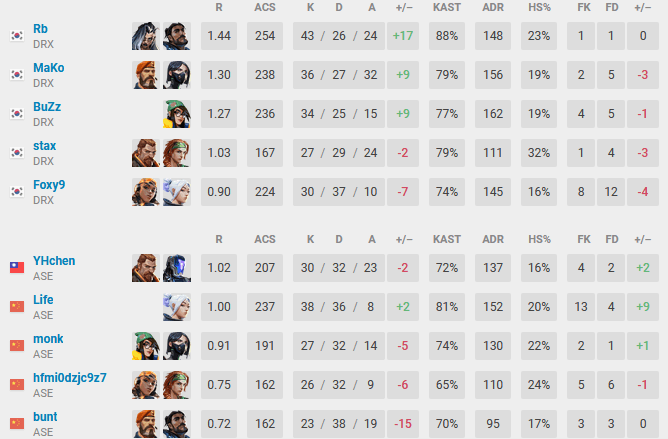 While ASE was able to put together a couple of rounds here and there, DRX always felt in control. Qu "Life" Donghao was the player dragging his squad through the game in the opening half. The duelist was one of the best players on the server with a rating of 1.31, with only MaKo having higher. Unfortunately, the young star from China was not able to replicate his impressive first-half performance down the street, seeing DRX take the lead in the series.