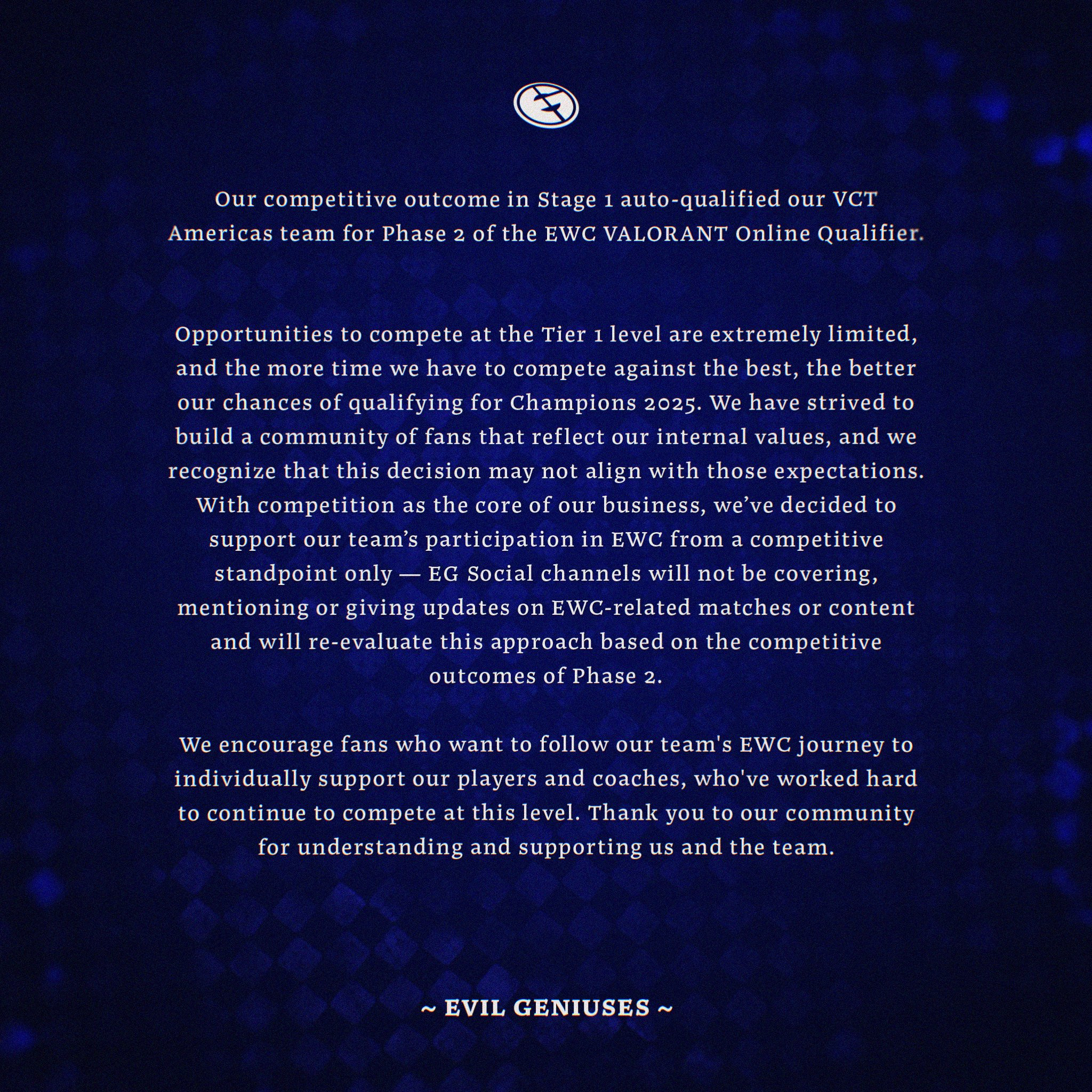 “We encourage fans who want to follow our team’s EWC journey to individually support our players and coaches, who’ve worked hard to continue to compete at this level,” EG concluded.